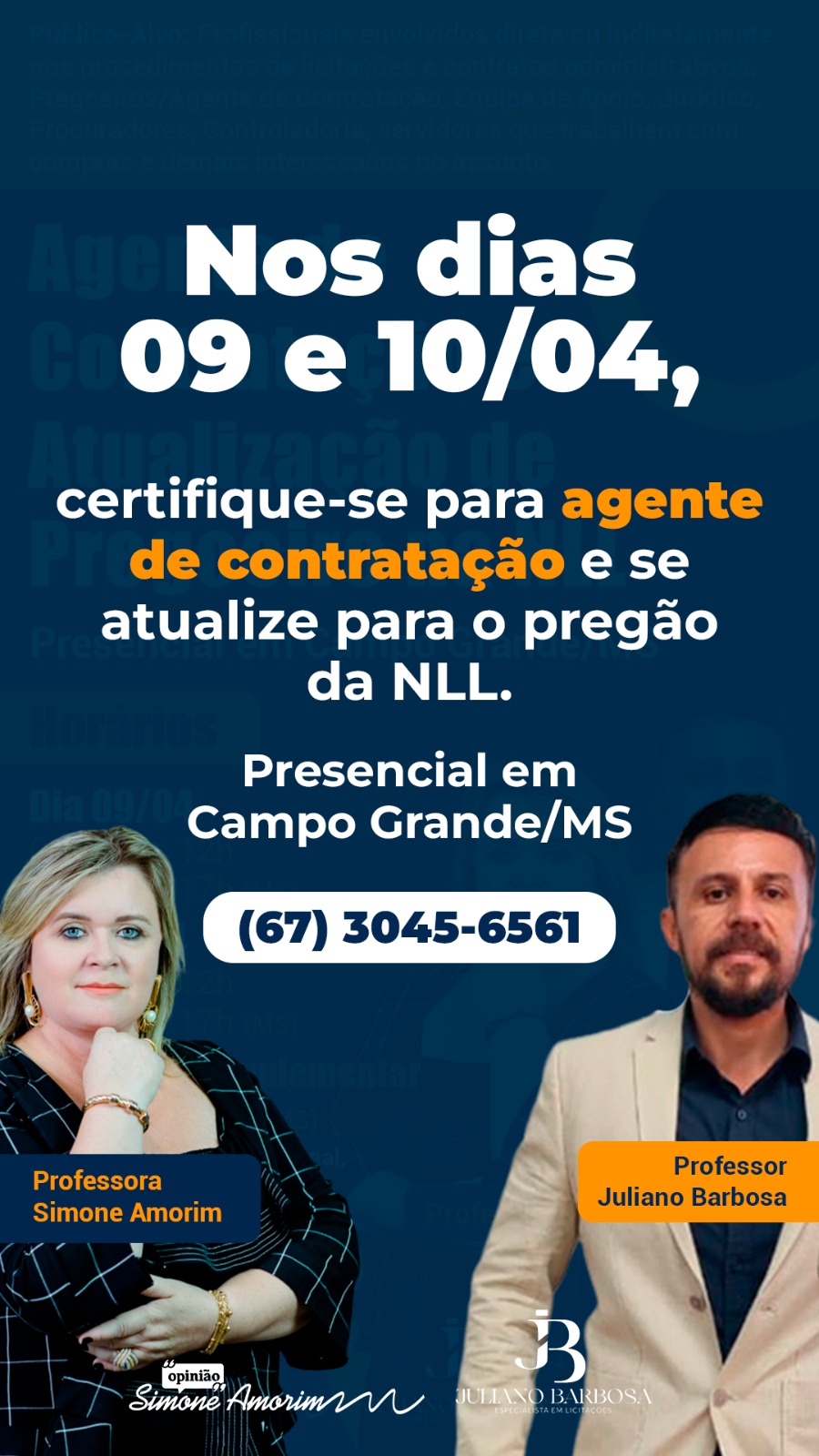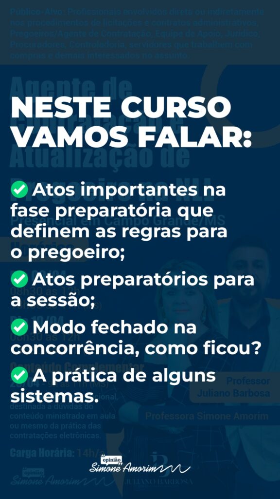 estarei nos dias 09 e 10 de Abril na sede da Capacitar Cursos e Treinamentos ministrando juntamente com a Dra Simone Amorim um curso para agentes de contratação, pregoeiros e servidores públicos da área de licitação.