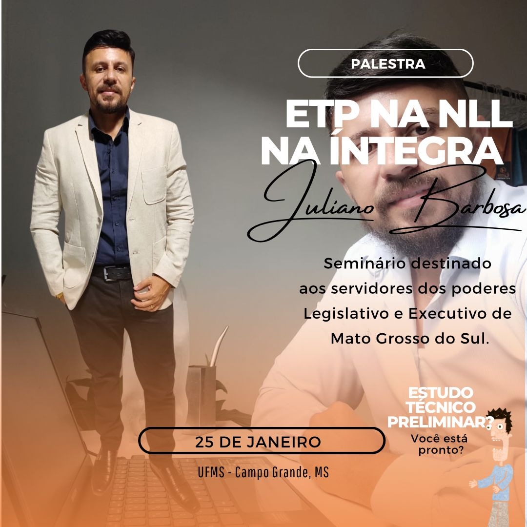 No dia 25 de janeiro as 14 h no auditório da UFMS em Campo Grande MS, estarei ministrando uma palestra- treinamento para servidores públicos municipais do legislativo e executivo sobre ETP – Estudo Técnico Preliminar com carga horária de 2 h.