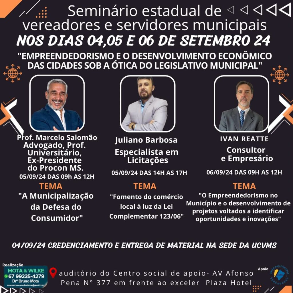 Nos próximos dias 04, 05 e 06 de setembro será realizado mais um Seminário com público alvo vereadores e servidores do legislativo do estado de MS.