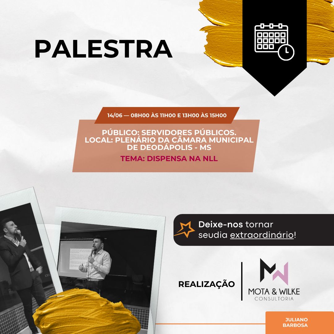 No dia 10 de outubro de 2025, estarei ministrando curso/treinamento aos servidores municipais do legislativo de Caracol – MS, tema: Dispensa e uso do